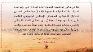 أكد السيد عبدالملك بدرالدين الحوثي في أغلب الخطابات الخاصة بمناسبة عاشوراء بأن الشعب اليمني يدرك طبيعة المعركة التي يخوضها اليوم في مواجهة قوى العدوان وعلى رأسها السعودية والإمارات وأن الشعب يعيش مظلومية الحسين عليه السلام بما يتعرض له من جرائم قصف وحصار.