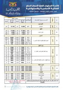 أصدرت وزارة الصناعة والتجارة في صنعاء ، لائحة سعرية مخفضة لأسعار السلع الغذائية الأساسية والاستهلاكية
