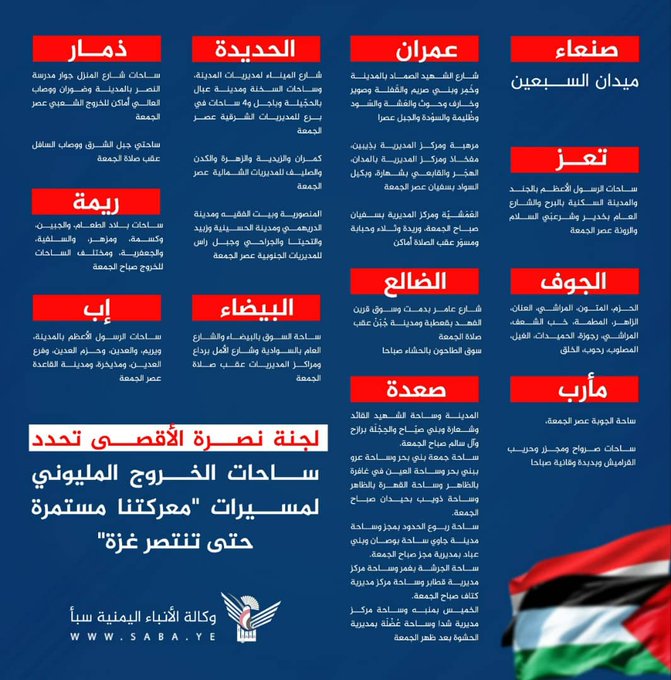 اليمنيون يتأهبون لطوفانهم المليوني الــ27 في العاصمة والمحافظات تحت شعار (معركتنا مستمرة حتى تنتصر غزة) ولجنة نصرة الأقصى تحدد الساحات