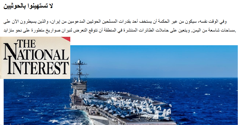 دعت مجلة ” المصلحة الوطنية -National interest “ المختصة في قضايا الدفاع والأمن القومي والشؤون العسكرية والأجهزة والسياسة الخارجية والسياسة الأمريكية إلى عدم الاستخفاف بالقدرات العسكرية لقوات صنعاء، وإن على حاملات الطائرات الأمريكية التي ستنتشر في المنطقة أن تتوقع التعرض لضربات أقوى بصواريخ متطورة.