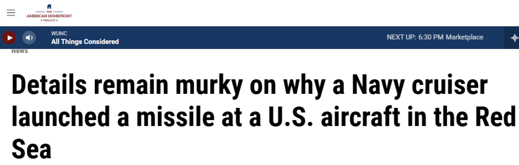 ووفقاً للموقع فقد “قالت البحرية الأمريكية إنها تواصل التحقيق في الأسباب التي أدت إلى إطلاق (يو إس إس جيتيسبيرج) النار على مقاتلة تابعة للبحرية في البحر الأحمر في الساعات الأولى من يوم 22 ديسمبر، ولم يصدر البنتاغون سوى القليل من التفاصيل عن الحادث”.
