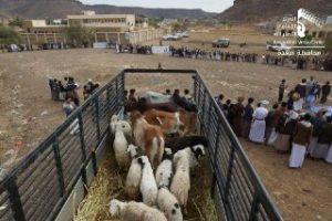 واثناء تسيير القافلة التي أحتوت على عشرات الاغنام و 6 عجول وعسل ومبالغ مالية كبيرة نظم الحاضرون وقفة إحتجاجية بحضور عدد من مسؤلي المحافظة ألقي فيها كلمات عديدة نددت بجرائم العدوان بحق النساء والأطفال والحرب الاقتصادية التي يفرضها العدوان على شعبنا اليمني المظلوم .