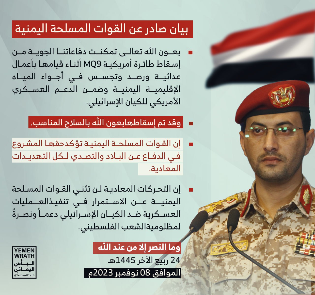 في الـــ8 من نوفمبر من العام 2023م أعلنت القوات المسلحة اليمنية إن الدفاعات الجوية اليمنية أسقطت طائرة أمريكية MQ9 أثناء قيامها بأعمال عدائية ورصد وتجسس في أجواء المياه الإقليمية اليمنية وضمن الدعم العسكري الأمريكي للكيان الإسرائيلي.