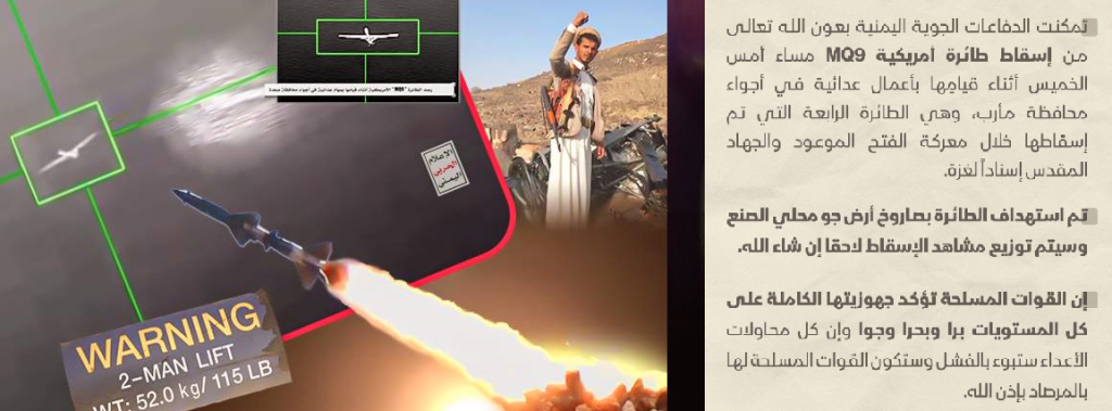وفي 19 من فبراير الفائت أعلنت القوات المسلحة عن إسقاط الطائرةَ الأمريكية َ”MQ9″ في أجواءِ محافظةِ الحديدة، كما نجحت قوات الدفاع الجوي نجحت في الـ26 أبريل الفائت في إسقاط طائرة أمريكية من ذات النوع أثناء قيامها بتنفيذ مهام عدائية في أجواء محافظة صعدة.