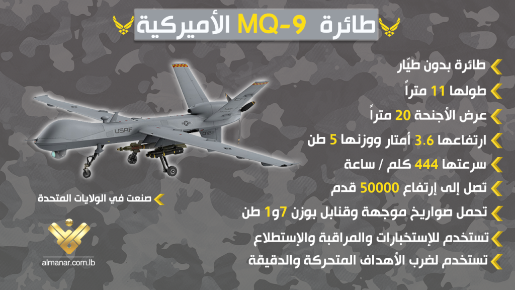 يذكر أن إم كيو-9 ريبر (MQ-9 Reaper) تعد من بين أحدث الطائرات الأمريكية بدون طيار وتضم مواصفات تكنولوجية عالية، منها نظام رادار متطور وكاميرات ومستشعرات عالية الدقة تستطيع مسح منطقة قطرها 360 درجة.