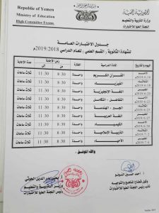وأوضح وكيل الوزارة لقطاع ال:اهج والتوجيه احمد النونو في تصريح لوكالة الأنباء اليمنية (سبأ) أن امتحانات طلاب الشهادة الأساسية ستبدأ يوم السبت الموافق ١٥ يونيو المقبل يليها في يوم الأحد الموافق ١٦ يونيو، امتحانات طلاب الثانوية العامة بقسميها العلمي والأدبي