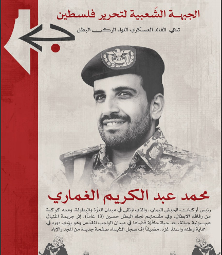 تتقدم الجبهة الشعبية لتحرير فلسطين إلى الشعب اليمني الشقيق الأبيّ، وإلى الإخوة في حركة أنصار الله، وإلى القيادة اليمنية، وإلى القوات المسلحة اليمنية الباسلة، وإلى أسرة الشهيد القائد بخالص العزاء وصادق المواساة في استشهاد القائد العسكري البارز اللواء الركن محمد عبد الكريم الغماري، رئيس أركان الجيش اليمني، الذي ارتقى في ميدان العزّة والبطولة، ومعه كوكبة من رفاقه الأبطال، وفي مقدمتهم نجله البطل حسين (13 عاماً)، إثر جريمة اغتيال صهيونية جبانة، بعد حياة حافلة قضاها في ميدان الواجب المقدّس وهو يؤدي دوره في حماية وطنه وإسناد غزة، مضيفاً إلى سجل الشهداء صفحة جديدة من المجد والإباء.