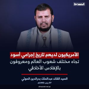 وأضاف السيد القائد: الموقف الأمريكي البريطاني موقف شاذ من بين كل الأمم والدول والشعوب في توصيف الجريمة التي يمارسها العدو الصهيوني