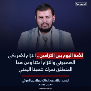 الأمة اليوم بين التزامين، التزام الأمريكي الصهيوني والتزام أمتنا ومن هذا المنطلق تحرك شعبنا اليمني