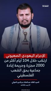 وقال الإجرام اليهودي الصهيوني ارتكب خلال 104 أيام أكثر من 2000 مجزرة وجريمة إبادة جماعية بحق الشعب الفلسطيني