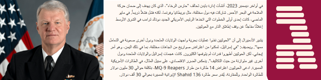ووجّه الأدميرال الأمريكي تحذيرًا من أن التجربة اليمنية أحدثت تحولًا في فهم التهديدات البحرية غير التقليدية، داعيًا الولايات المتحدة إلى الاستثمار في منظومات دفاعية جديدة قادرة على مواجهة هذا النوع من القدرات، التي أثبت اليمنيون أنهم يمتلكونها بكفاءة لافتة.