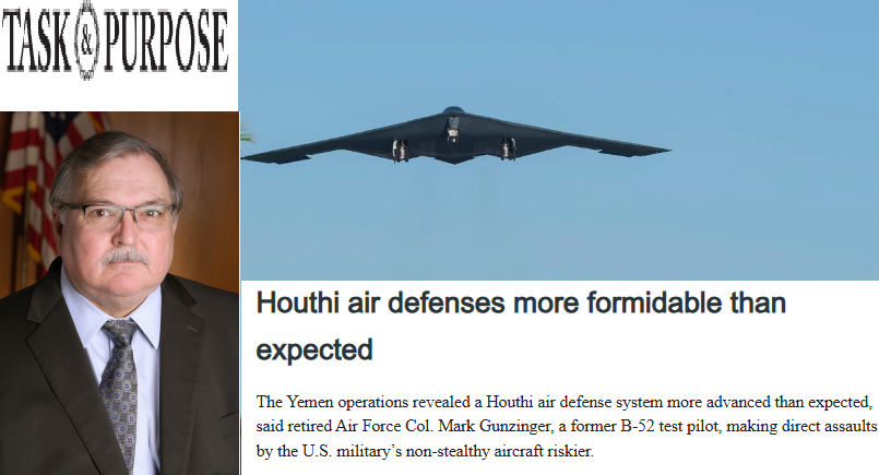 اعترفت القوات الأمريكية بامتلاك قوات صنعاء ، دفاعاً جوياً فعالاً يمثل تهديداً حقيقياً للمقاتلات الحربية ونقل موقع “تاسك آند بيربس -المهمة والغرض ” الأمريكي الأمريكي المتخصص بالشؤون العسكرية عن العقيد المتقاعد في القوات الجوية الأمريكية مارك جونزينجر، طيار اختبار سابق لطائرة B-52، قوله إن «العمليات في اليمن كشفت عن نظام دفاع جوي يمني أكثر تقدماً من المتوقع، مما يجعل الهجمات المباشرة بالطائرات غير الشبحية التابعة للجيش الأمريكي أكثر خطورة».
