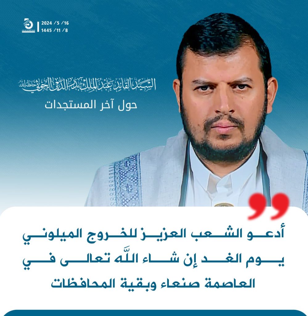 دعا السيد القائد عبد الملك بدر الدين الحوثي يحفظه الله الشعب اليمني للاستمرار في الخروج الميلوني يوم غدا الجمعة في العاصمة صنعاء وبقية المحافظات نصرة لغزة.