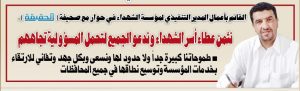 القائم بأعمال المدير التنفيذي لمؤسسة الشهداء في حوار خاص مع صحيفة الحقيقة: نثمن عطاء أسر الشهداء وندعو الجميع لتحمل المسؤولية تجاههم
