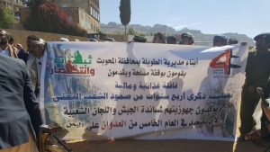 وخلال تسيير القافلة نظمت قبائل المديرية وقفة للتنديد بجرائم العدوان وذلك في إطار أربعة أعوام من الصمود في وجه العدوان.