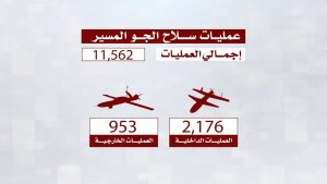 وإلى جانب القوة الصاروخية يحضر اليمن العزيز الابي الصامد بقوة بسلاح أصبح له أهمية على صعيد المعارك العسكرية حيث نفذ سلاح الجو المسير بعون الله تعالى 11562 عملية منها 2176 عملية داخلية و 953عملية خارجية فيما بلغ عدد عمليات الاستطلاع 8433 عملية”.