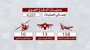 وفيما يخص عمليات قوات الدفاع الجوي اكد العميد سريع ان اجمالي عمليات الدفاع الجوي بلغ 4221 عملية تنوعت عمليات الدفاع الجوي ما بين التصدي والاجبار على المغادرة وكذلك الاعتراض والاسقاط .