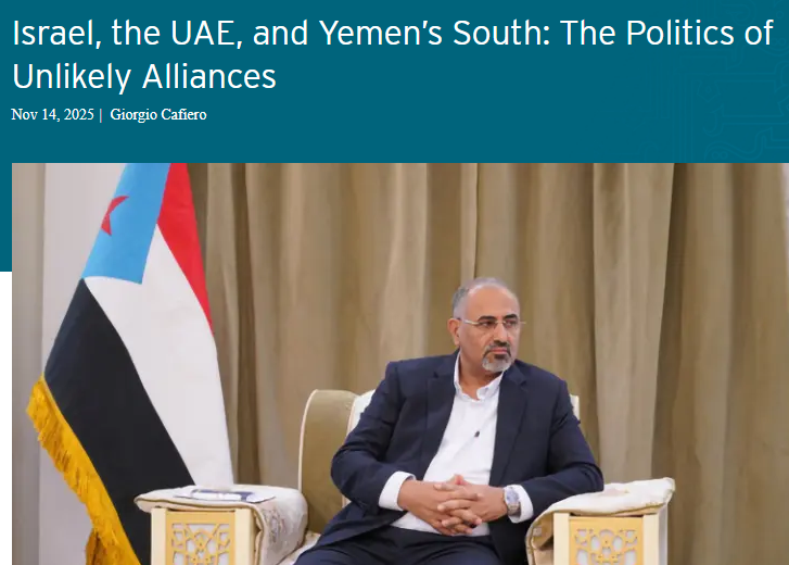 كشف معهد الأبحاث الأمريكي ” المركز العربي واشنطن دي سي –Arab Center for Washington D.C ” في تقرير حديث عن، تنامي الاهتمام الإسرائيلي بالفصائل اليمنية المدعومة إماراتيًّا، وعلى رأسها المجلس الانتقالي الجنوبي وقوات طارق صالح، في إطار تنسيقٍ متصاعد بين أبوظبي وكَيان الاحتلال الصهيوني يستهدفُ التأثيرَ على موازين القوى في اليمن ومحيط باب المندب وخليج عدن