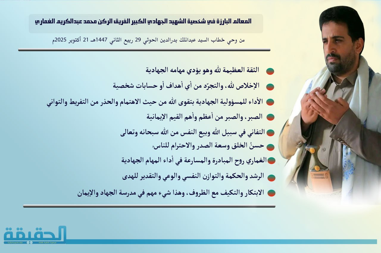 المعالم البارزة في شخصية الشهيد الجهادي الكبير الفريق الركن محمد عبدالكريم الغماري من وحي خطاب السيد عبدالملك بدرالدين الحوثي 29 ربيع الثاني 1447هـ 21 أكتوبر 2025م On أكتوبر 21, 2025 Share