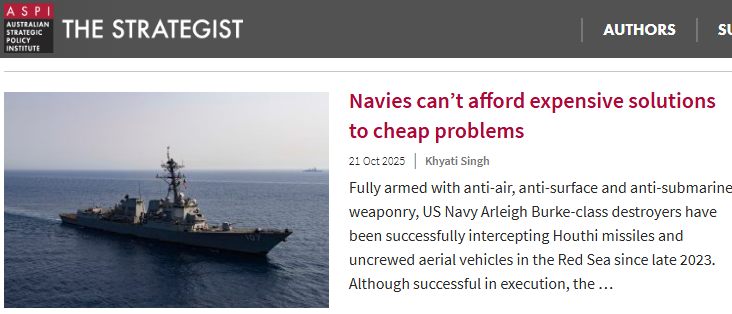 قال المعهد الأسترالي للسياسة الاستراتيجية إن المواجهات الأخيرة في البحر الأحمر كشفت خللاً واضحاً في معادلة تكاليف الدفاع البحري، بحيث أن أسلحة اعتراضية متطورة تُستهلك لمواجهة هجومات طائرات وصواريخ مسيّرة رخيصة الثمن، مما يضع حاملات السفن والمدمرات في موقف يعتمد أكثر على عمق مخزون الذخيرة منه على جودة الأنظمة، محذراً من أن هذا الخلل قد يتحول إلى مشكلة استراتيجية كبيرة في صراع ممتد أو ضد منافس صناعي ضخم.