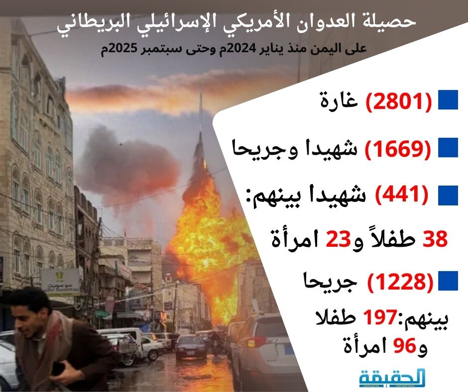 اليمن: تقرير يكشف حصيلة العدوان الأمريكي الإسرائيلي البريطاني من يناير 2024 حتى سبتمبر 2025