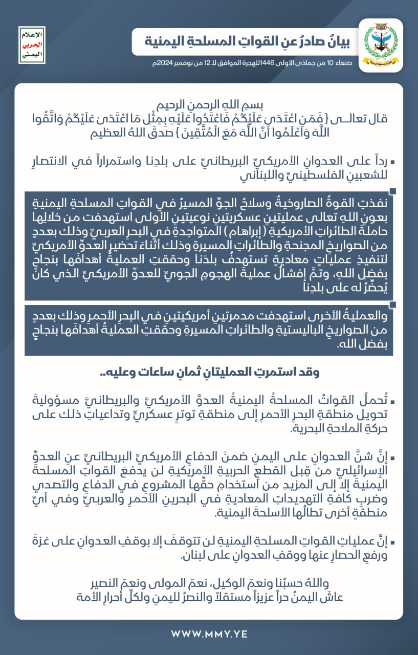 العودة إلى "اليمن: تنفيذ عمليتين عسكريتين نوعيتين استهدفت حاملة طائرات ومدمرتين أمريكية في البحرين الأحمر…" بيان القوات المسلحة التالي