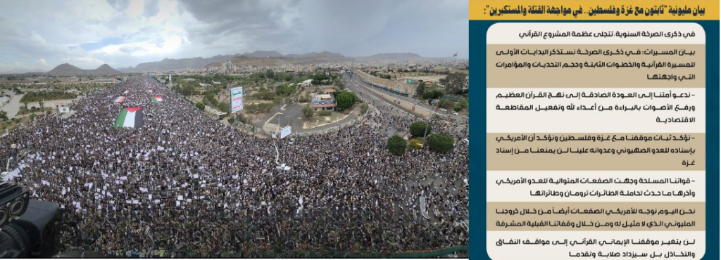 شهدت العاصمة صنعاء وعدة محافظات يمنية، اليوم الجمعة، فعاليات مليونية حاشدة تحت شعار “ثابتون مع غزة وفلسطين.. في مواجهة القتلة والمستكبرين”، إسنادا لغزة وتحديا للعدوان الأمريكي على بلادنا، واستجابة لدعوة السيد القائد عبدالملك بدرالدين الحوثي وذلك بالتزامن مع الذكرى السنوية لإطلاق شعار “الصرخة”، وسط تأكيد شعبي ورسمي على التمسك بنهج “المسيرة القرآنية” ورفض الهيمنة الأمريكية والإسرائيلية.