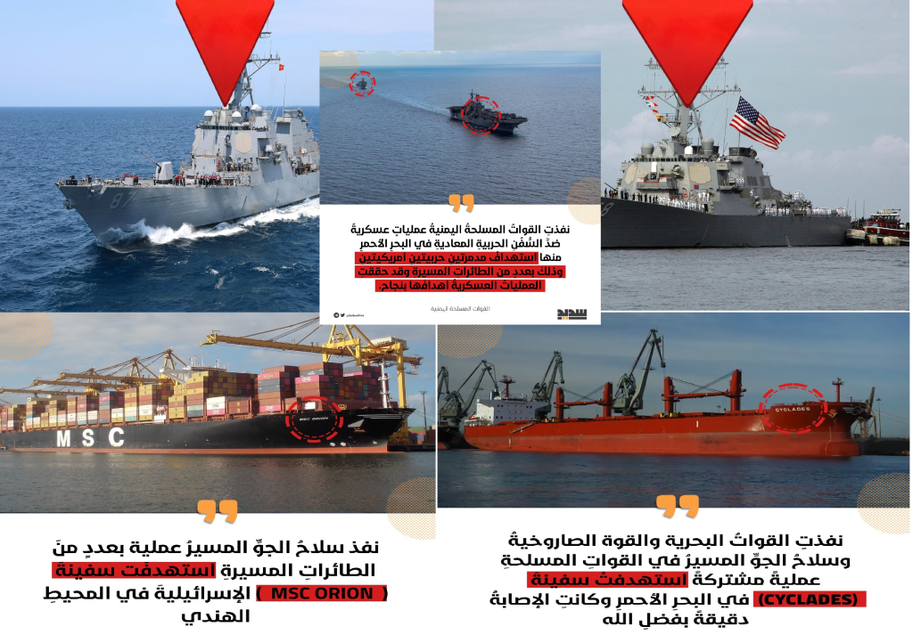 وأكمل العميد سريع: ” السفينة (CYCLADES) أصرت على انتهاك قرار المنع فأصبحت في قائمة السفن المستهدفة والممنوعة من الإبحار في منطقة علميات قواتنا، كما واستهدفنا بعدد من الطائرات المسيرة سفينة (MSC ORION) الإسرائيلية في المحيط الهندي”.