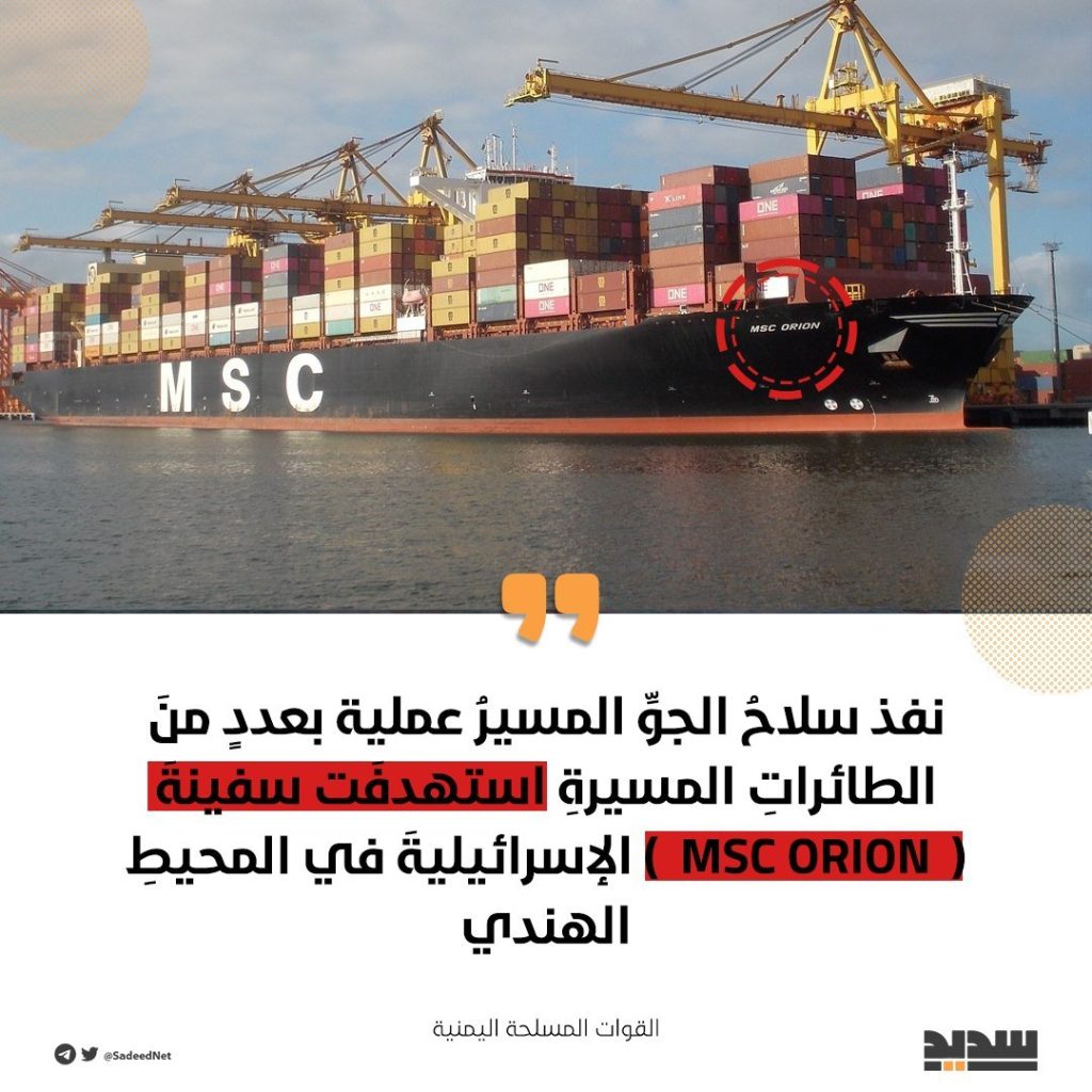 استهداف السفينة MSC ORION الإسرائيلية في المحيط الهنديبعدد من الطائرات المسيرة