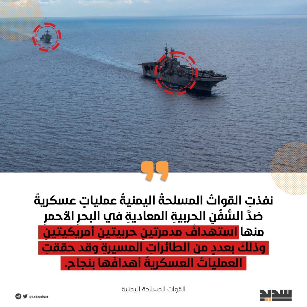 أعلن الناطق باسم القوات المسلحة اليمنية العميد يحيى سريع، تنفيذ عمليات عسكرية ضد السفن الحربية المعادية في البحر الأحمر منها استهداف مدمرتين أمريكيتين بعدد من الطائرات المسيرة”.