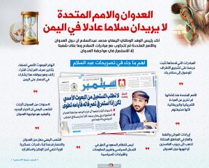 انفوغرافيك.. العدوان والامم المتحدة لا يريدان سلاما عادلا في اليمن On يوليو 28, 2020 أكد رئيس الوفد الوطني محمد عبد السلام أن دول العدوان والأمم المتحدة لم تتجاوب مع مبادرات السلام وما على شعبنا إلا الاستمرار في مواجهة العدوان Share