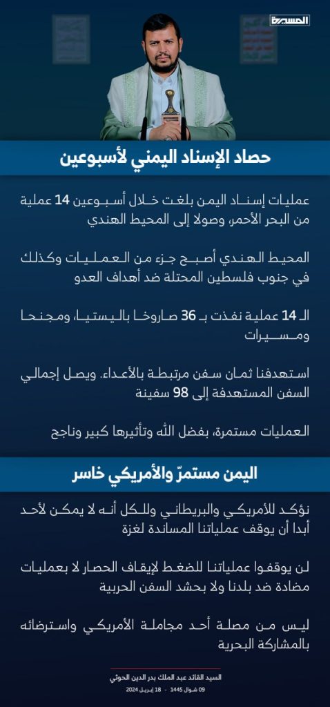 انفو جرافيك :أبرز ما ورد في خطاب قائد الثورة عن آخر أحداث العدوان على غزة ، والموقف اليمني وأبرز المستجدات العربية والإقليمية – 18أبريل 2024م