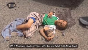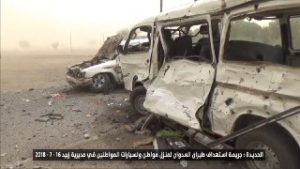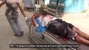 كما ارتكب ظهر اليوم جريمة اخرى باستهداف باص وسيارتين للمسافرين في الخط العام الرابط بين مدريتي زبيد والجراحي راح ضحيتها شهيد و6 جرحى من المواطنين