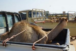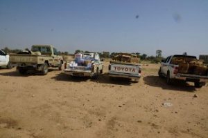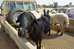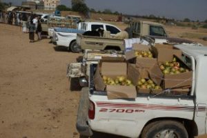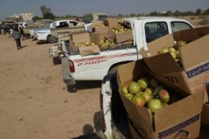 القافلة الغذائية أحتوت على عدد من سلال الرمان والعشرات من الأغنام ومواد غذائية متنوعة .
