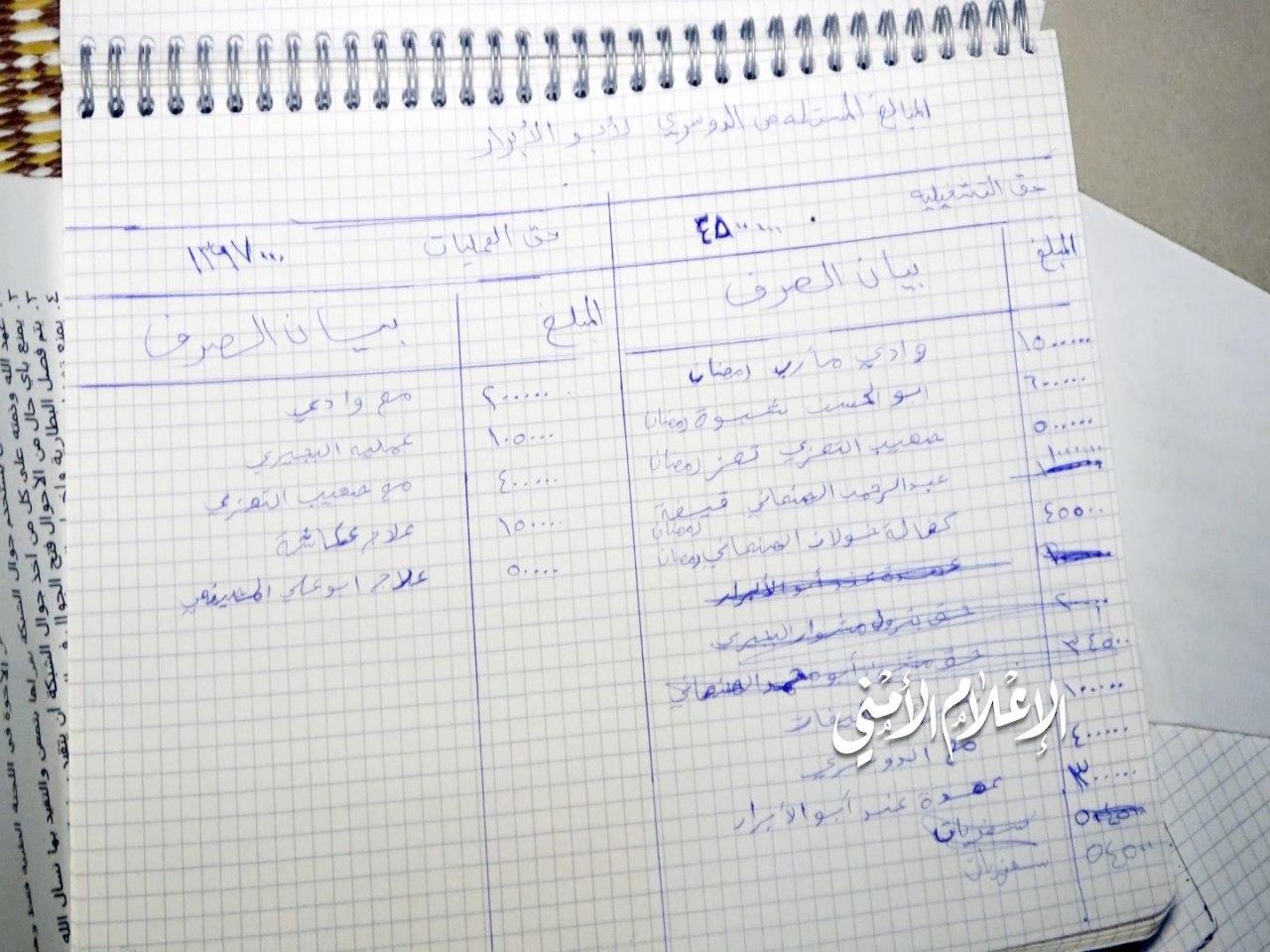 الصورة الأولى لوثيقة لتنظيم القاعدة وفيها أوجه صرف مبالغ مالية مستلمة من المدعو الدوسري سعودي الجنسية سلمت للمدعو أبو الأبرار وفي ثنايا الصرف مبالغ صرفت لمناطق وادي مارب وشبوه وتعز وفيها ينشط عناصر التنظيم ومليشيا الإصلاح تحت عنوان مقاومة تابعة لما يسمى الشرعية.