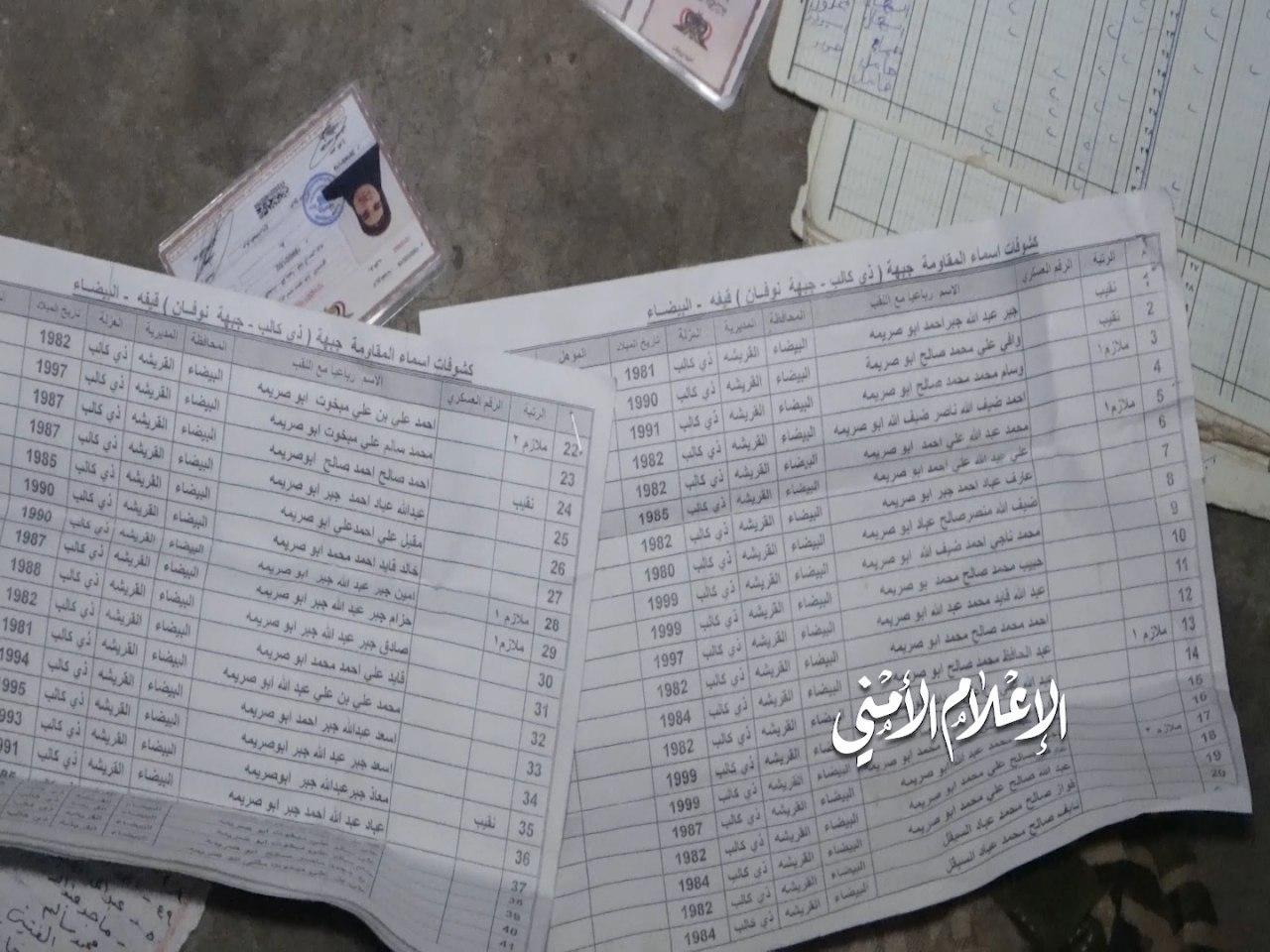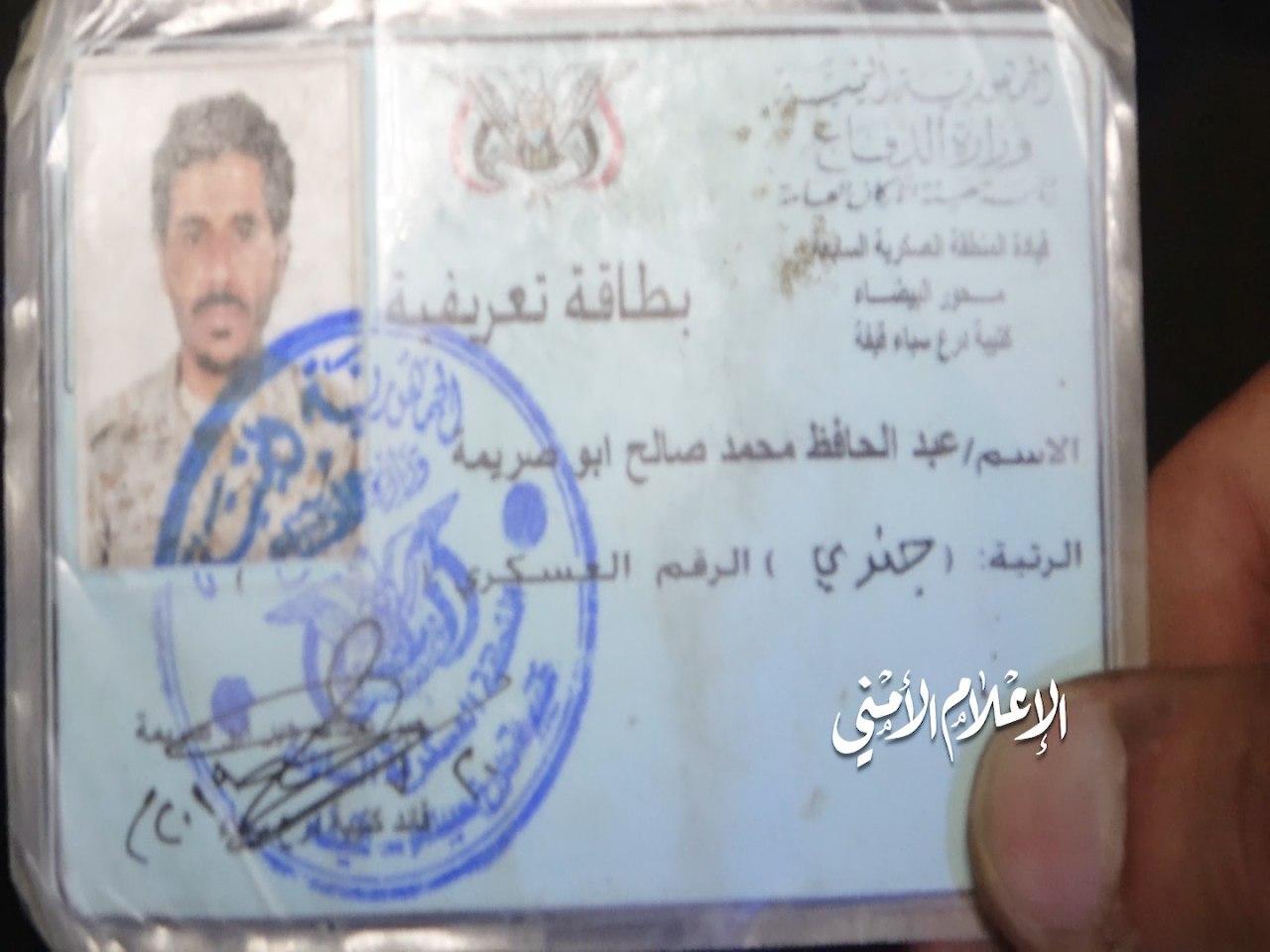 وفي الصورة الرابعة بطاقة عسكرية لأحد عناصر القاعدة عبد الحافظ محمد أبو صريمه عثر عليها بمعمل لصناعة الأحزمة والعبوات الناسفة تابع للقاعدة في منطقة قيفة، ويبدوا أنه من صانعي المتفجرات، البطاقة العسكرية الصادرة من وزارة الدفاع التابعة لمرتزقة العدوان تفيد بانتسابه إلى قيادة المنطقة العسكرية السابعة محور البيضاء كتيبة درع سبأ قيفه.