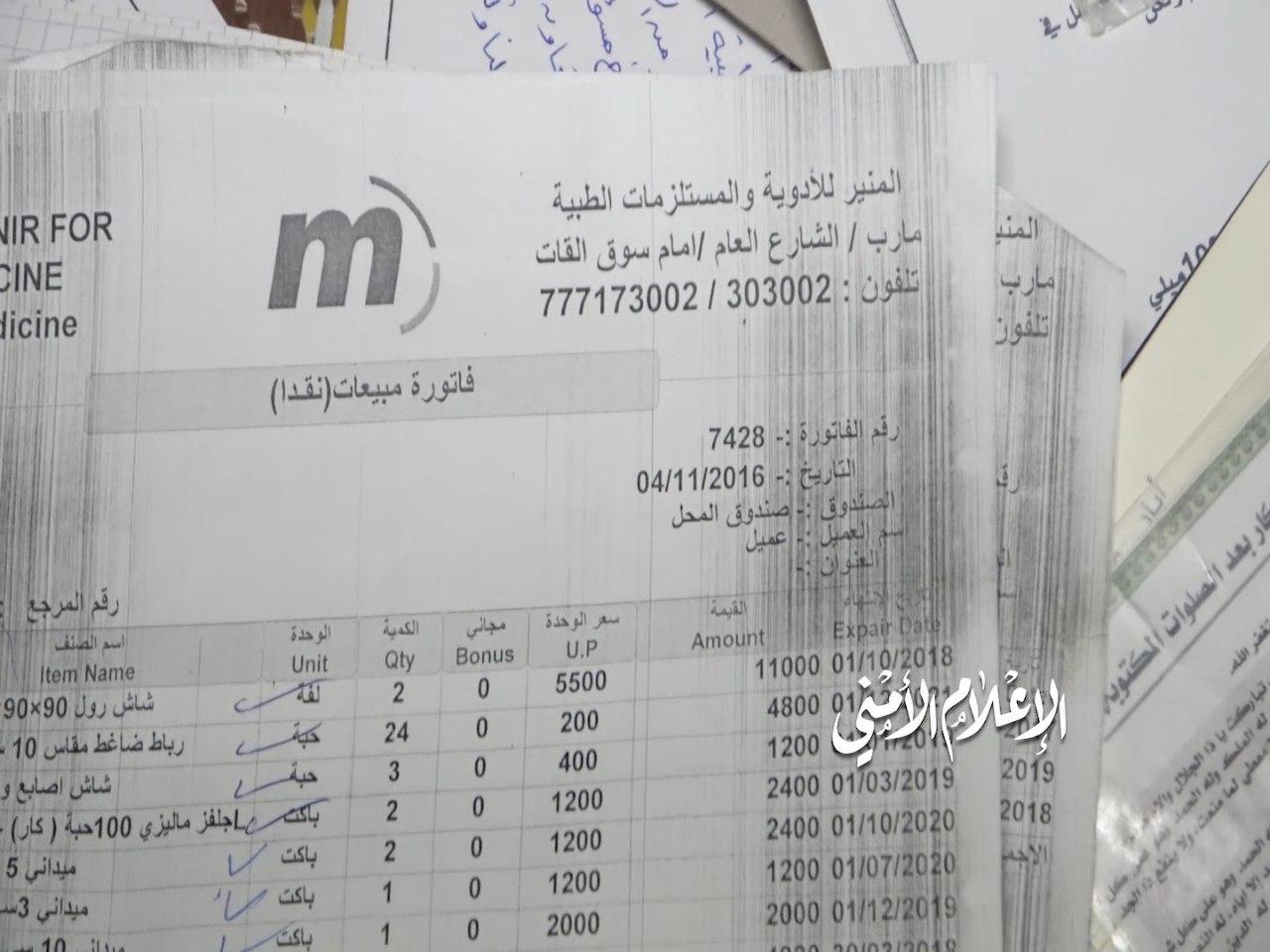 في الصورة الثانية فاتورة شراء أدوية تؤكد أن مأرب التي يسيطر عليها الإصلاح تحت عباءة ما تسمى الشرعية هي وجهة تنظيم القاعدة ليتزود باحتياجاته من الأدوية من مأرب، وربما غيرها من الاحتياجات.