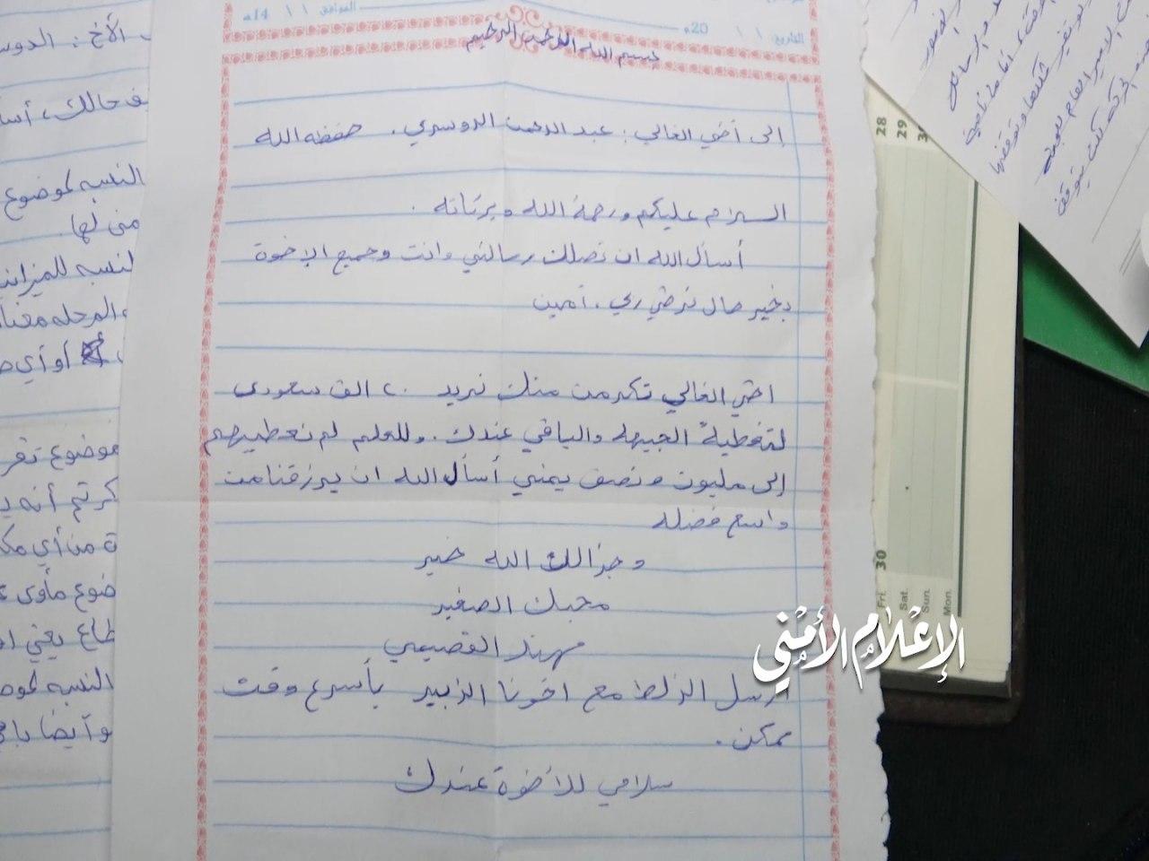 في الصورة الثالثة في هذه الوثيقه يظهر تحكم الجنسيات السعودية بتمويل جزء من نشاطات القاعدة، وثيقة يطلب فيها المدعو القصيمي من أبو عبد الرحمن الدوسري وكلاهما جنسية سعودية مبلغ 20 ألف ريال سعودي تغذية للجبهة ويشكو أنه لم يصرف له سوى مليون ونصف ريال يمني، ويطلب إرسالها على وجه السرعة مع المدعو أبو الزبير.