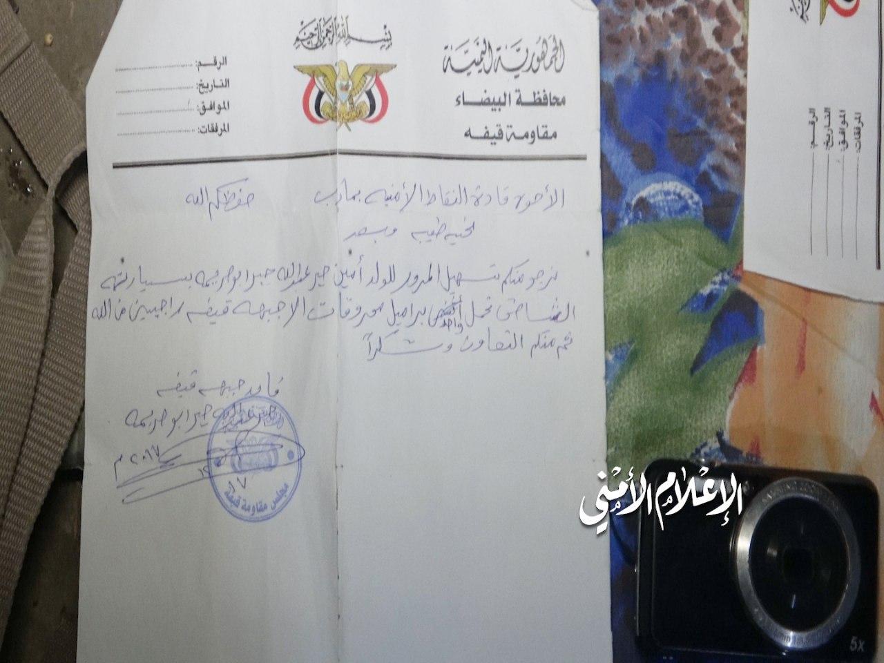 صورة لوثيقة يطلب فيها قائد جبهة قيفه بتنظيم القاعدة من نقاط مارب تسهيل مرور شحنة وقود إلى التنظيم في جبهة قيفه، ومؤكد أن مثل هذه التصاريح لاتمر دون علم تحالف العدوان.