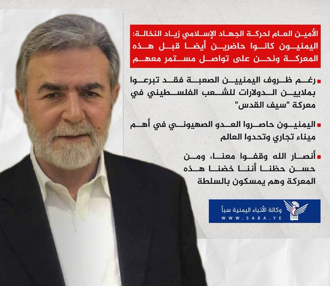 وأكد زياد النخالة في حوار له مع موقع قائد الثورة الإسلامية في إيران السيد علي خامنئي، أن اليمنيين رغم الظروف الصعبة فقد تبرعوا بملايين الدولارات للشعب الفلسطيني في معركة “سيف القدس”.