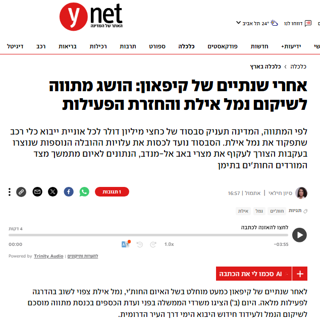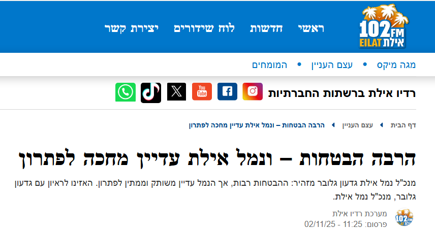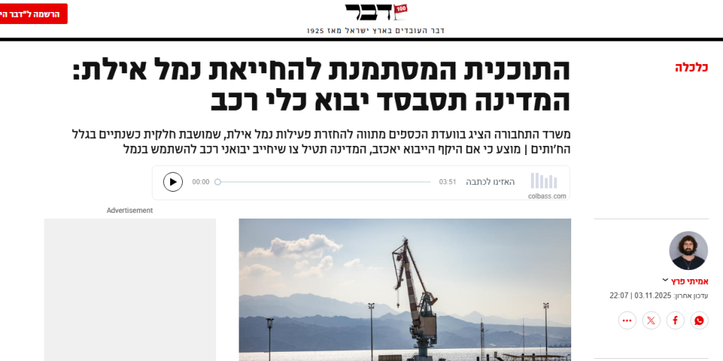 ميناء إيلات ولا يزال الميناء يواجه تحديات كبيرة، على الرغم من الوعود العديدة بحل مشاكله، حيث من الواضح أنه بحلول نوفمبر/تشرين الثاني 2025، يفتقر إلى التقدم بشكل كبير وينتظر الميناء حلولاً طويلة الأجل .