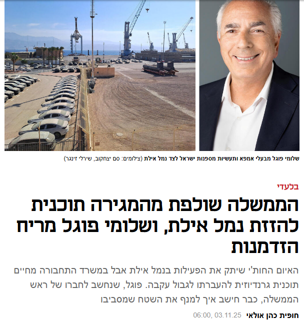 وأشَارَ الموقع إلى أن رجل الأعمال شلومي فوجل، المعروف بقربه من رئيس الوزراء بنيامين نتنياهو، تمكّن من استغلال المنطقة المحيطة بالموقع المقترح للميناء الجديد؛ ما يمنحه فرصة اقتصادية واعدة في حال تنفيذ المشروع.