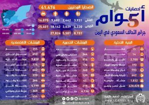 خلال خمسة أعوام لم يترك تحالف العدوان جُرماً إلا وارتكبه في اليمن، ولا أخضراً ولا يابساً إلا واستهدفه و أمعن في ارتكاب الجرائم المروعة وجرائم الحرب والانتهاكات الجسيمة والأشد خطراً بحسب ما أجمعت عليه المنظمات الحقوقية ، في ظل تجاهل دولي مريب، جعل من مفهوم حقوق الإنسان أشبه بكوميديا هزلية لعدوان همجي، عجزت الأمم المتحدة عن حماية أو صون الحقوق التي تتغنى بالدفاع عنها.
