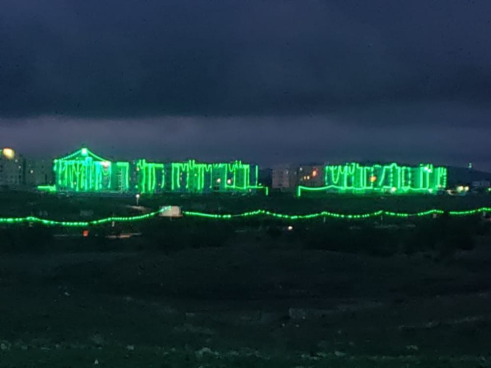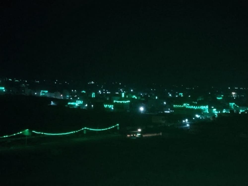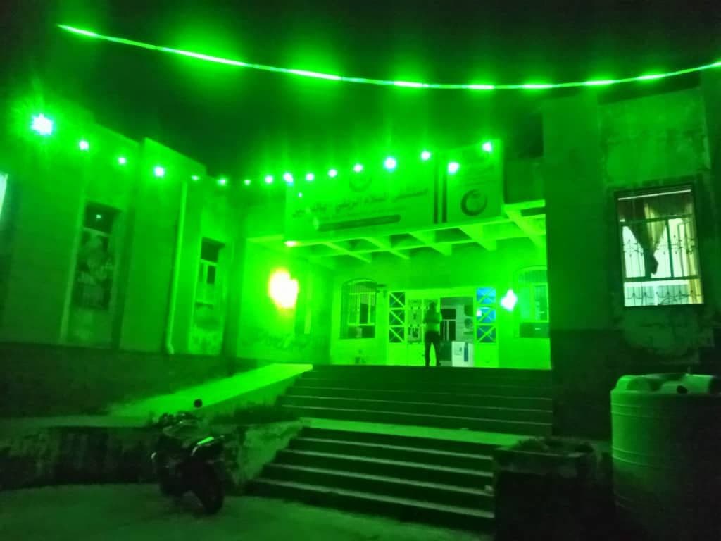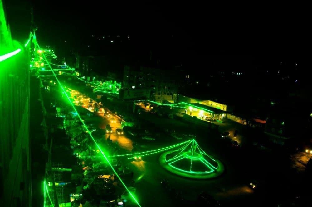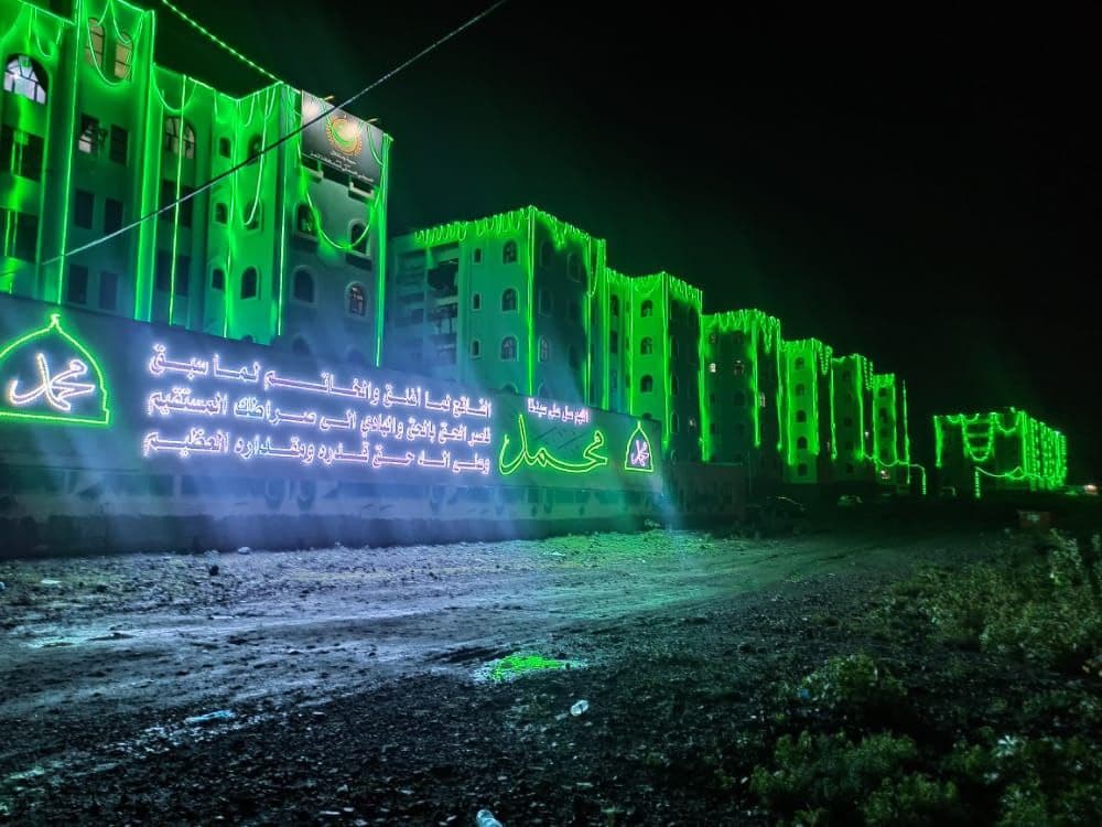 وأضاءت الألوان الخضراء ليل شوارع وأحياء محافظة تعز، وعلقت المحال والشركات والمنشئات العامة والخاصة سلاسل الألوان الخضراء لتزين واجهات مبانيها.