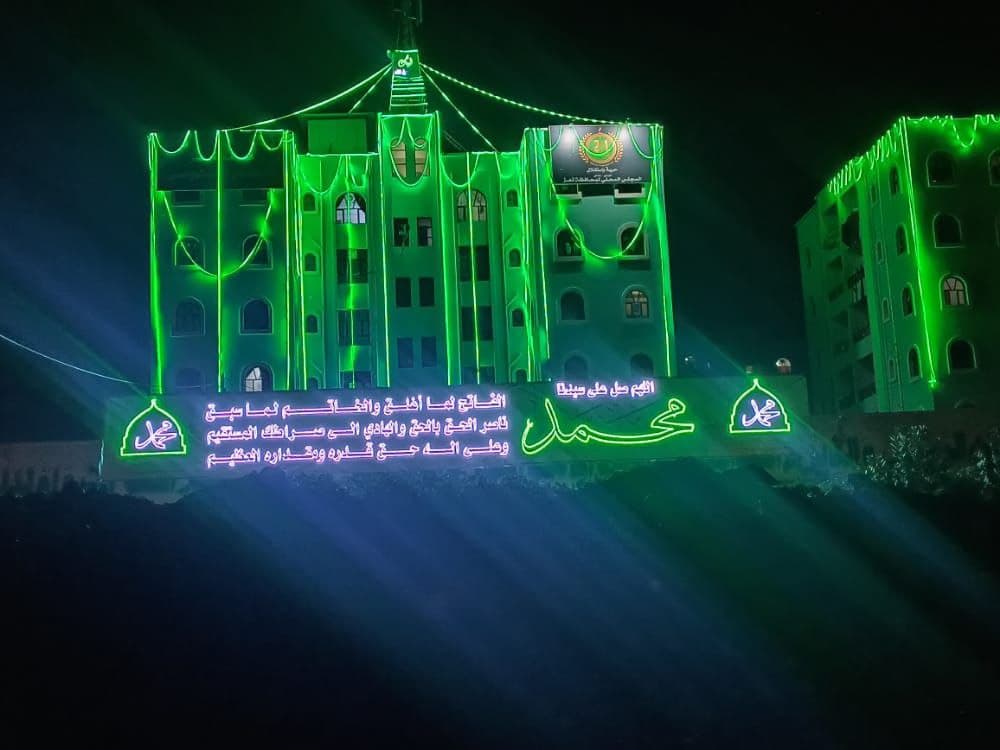 لبست صنعاء حلة خضراء زاهية واكتست شوارعها وأزقتها ومداخلها وعدد من مبانيها بالرايات والأضواء الخضراء والبيضاء في مشهد بديع يجسد مكانة الرسول في نفوس وقلوب أبناء الشعب اليمني في كل الظروف والأحوال وأنهم ماضون على نهجه الرباني في مواجهة الأعداء ومخططاتهم.