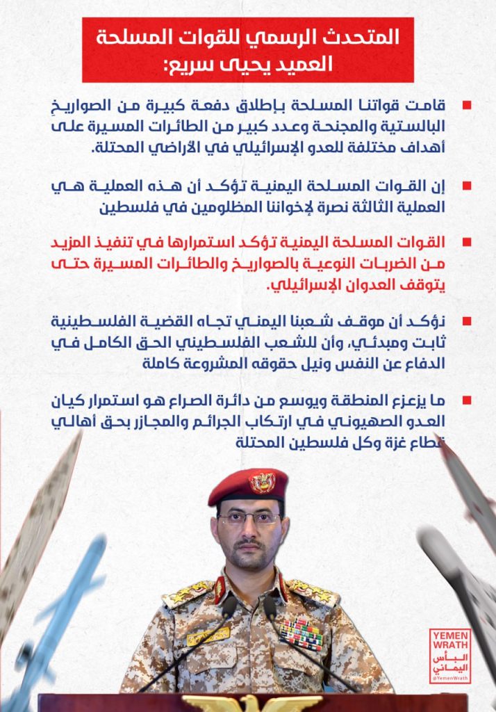 إن القواتِ المسلحةَ اليمنيةَ تؤكدُ أن هذه العمليةَ هي العمليةُ الثالثةُ نصرةً لإخوانِنا المظلومينَ في فلسطينَ، وتؤكدُ استمرارَها في تنفيذِ المزيدَ من الضرباتِ النوعيةِ بالصواريخِ والطائراتِ المسيرةِ حتى يتوقفَ العدوانُ الإسرائيلي.