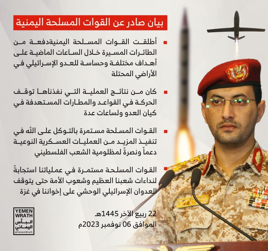 بيان صادر عن القوات المسلحة اليمنية -22 ربيع الآخر 1445هـ الموافق 6 نوفمبر 2023م