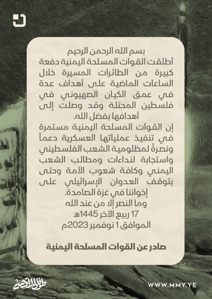بيان صادر عن القوات المسلحة اليمنية – 17 ربيع الآخر 1445هـ الموافق 1 نوفمبر 2023م