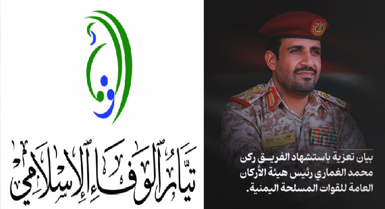 بقلوب مؤمنة بقضاء الله وقدره، ونفوس تعتليها هامات الفخر والعزّ، يتقدم تيار الوفاء الإسلامي بأحر التعازي وأصدق التبريكات إلى الأمة العربية والإسلامية، وإلى الشعب اليماني العزيز، وإلى أنصار الله وفي مقدمتهم القائد السيد عبد الملك الحوثي (حفظه الله وأيّده)، باستشهاد القامة الجهادية الفريق الركن/ محمد عبد الكريم الغماري، رئيس هيئة الأركان العامة للقوات المسلحة اليمنية، الذي ارتقى مع نجله وعدد من إخوانه، شهيداً ضمن قافلة العظماء على طريق القدس.