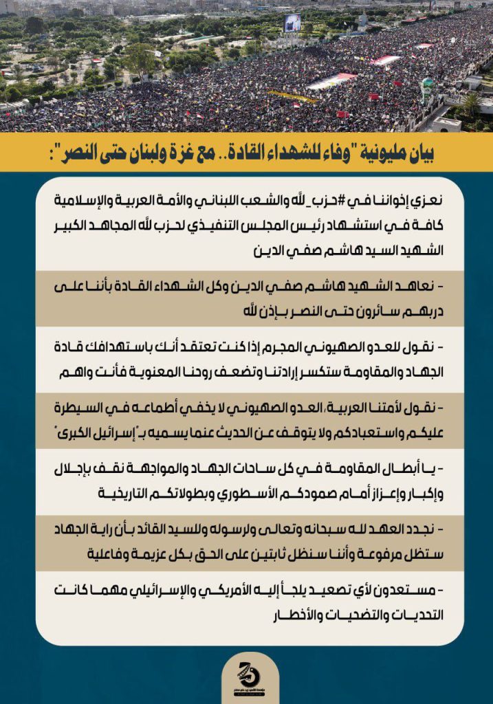 وعبر عن التعازي للأخوة في حزب الله والشعب اللبناني والأمة العربية والإسلامية كافة في استشهاد رئيس المجلس التنفيذي لحزب الله، المجاهد الكبير العلامة الشهيد هاشم صفي الدين.. معاهداً الشهيد وكل الشهداء القادة بالسير على دربهم حتى النصر.